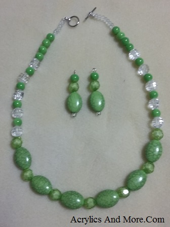 Translucent Green beads with small dark green beads and crystal beads at the back of the neck for length and ease of connecting. Earrings included, although not pictured here.
