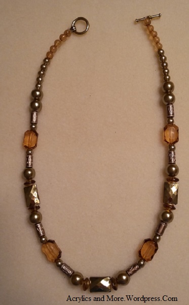 TOPAZ and ANTIQUE BROWN ACRYLIC beads. 18″ long. Brass Toggle Clasp.