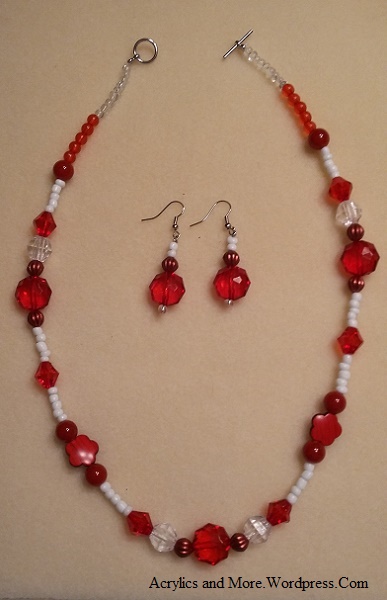 RED, WHITE and CLEAR ACRYLIC and glass beads. 22″ long with earrings.