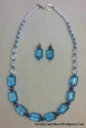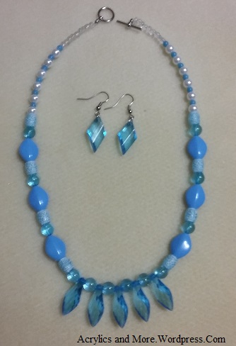 Light blue, mostly acrylic necklace with pearls and clear glass beads; dangles are in blue crystal, with matching earrings. This is a Princess length necklace at 17 1/4″ long.