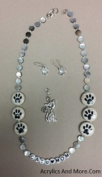 Specialty order item. Silver reflective beads and ceramic paw print beads, with ‘Cat Mom” alphabet beads. Crystal studded silver cat pendant, and silver paw print earrings with Crystal stone. This is a long 26″ necklace, without the pendant. (Price here includes shipping.)